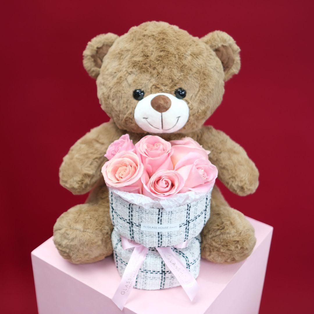 Give the warmth of love and surprise your special someone with Teddy's Embrace. The perfect blend of cuteness and elegance of a teddy bear and six Ecuadorian roses bouquet wrapped in our signature tweed.