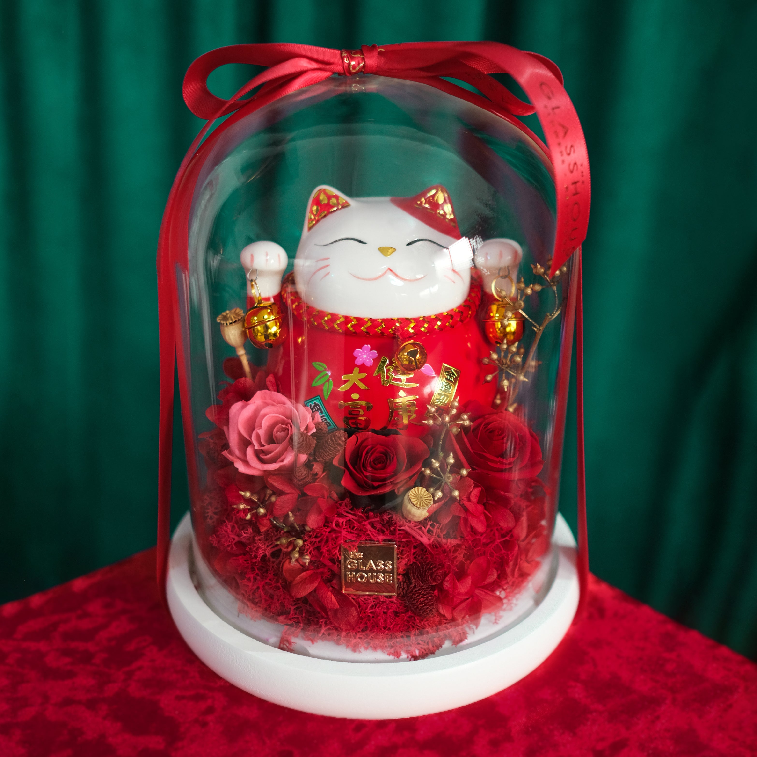 Lucky Cat Bell Glass Dome - Red (Good Fortune)
