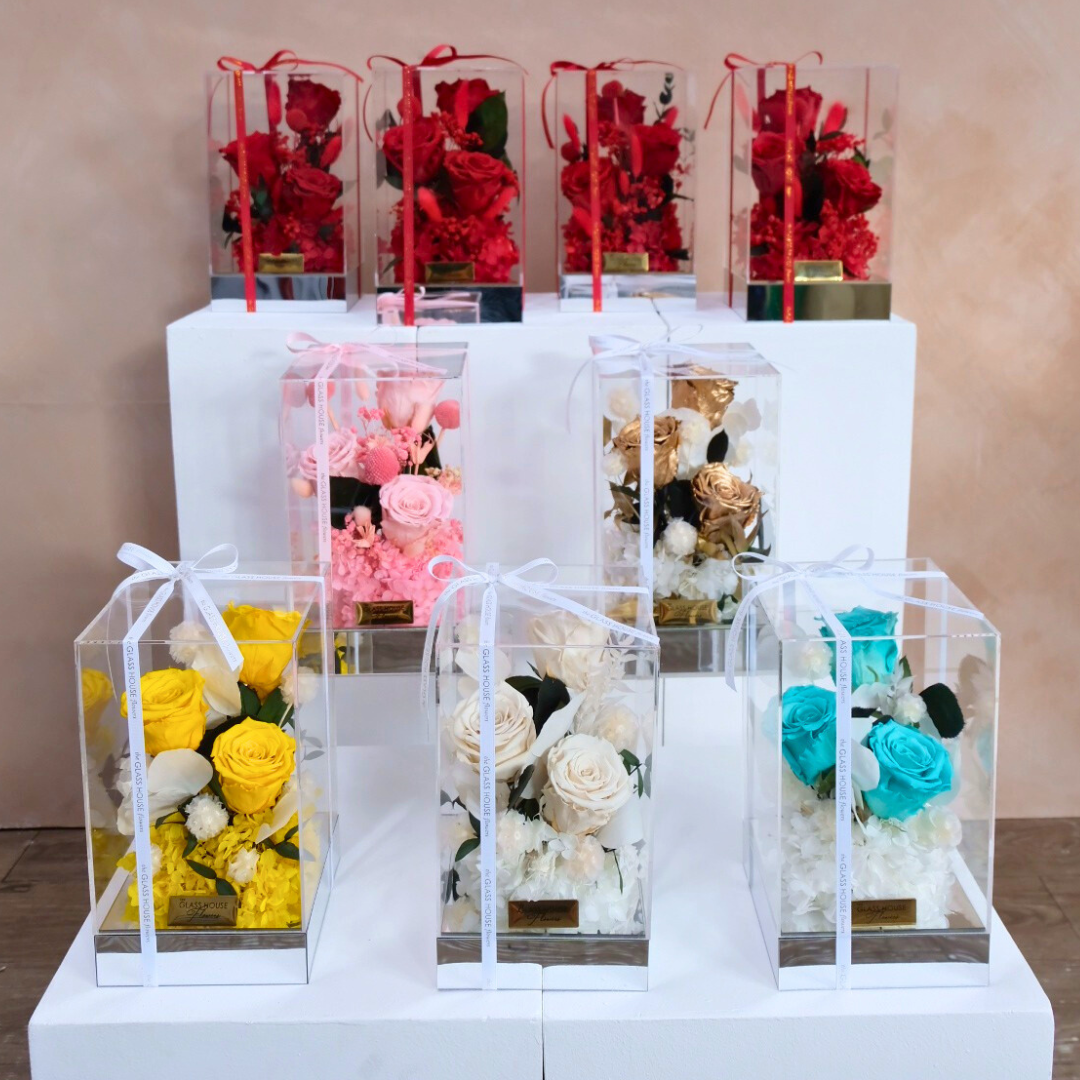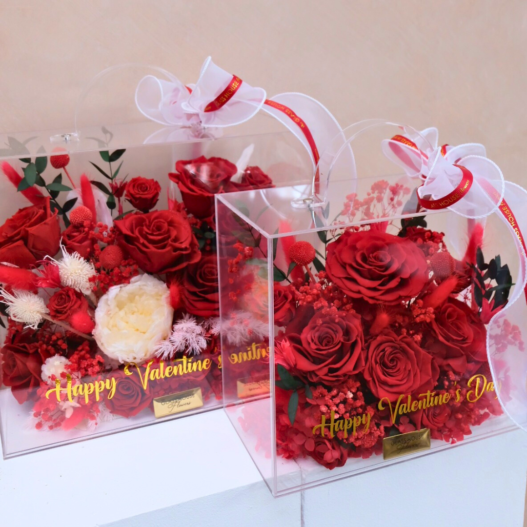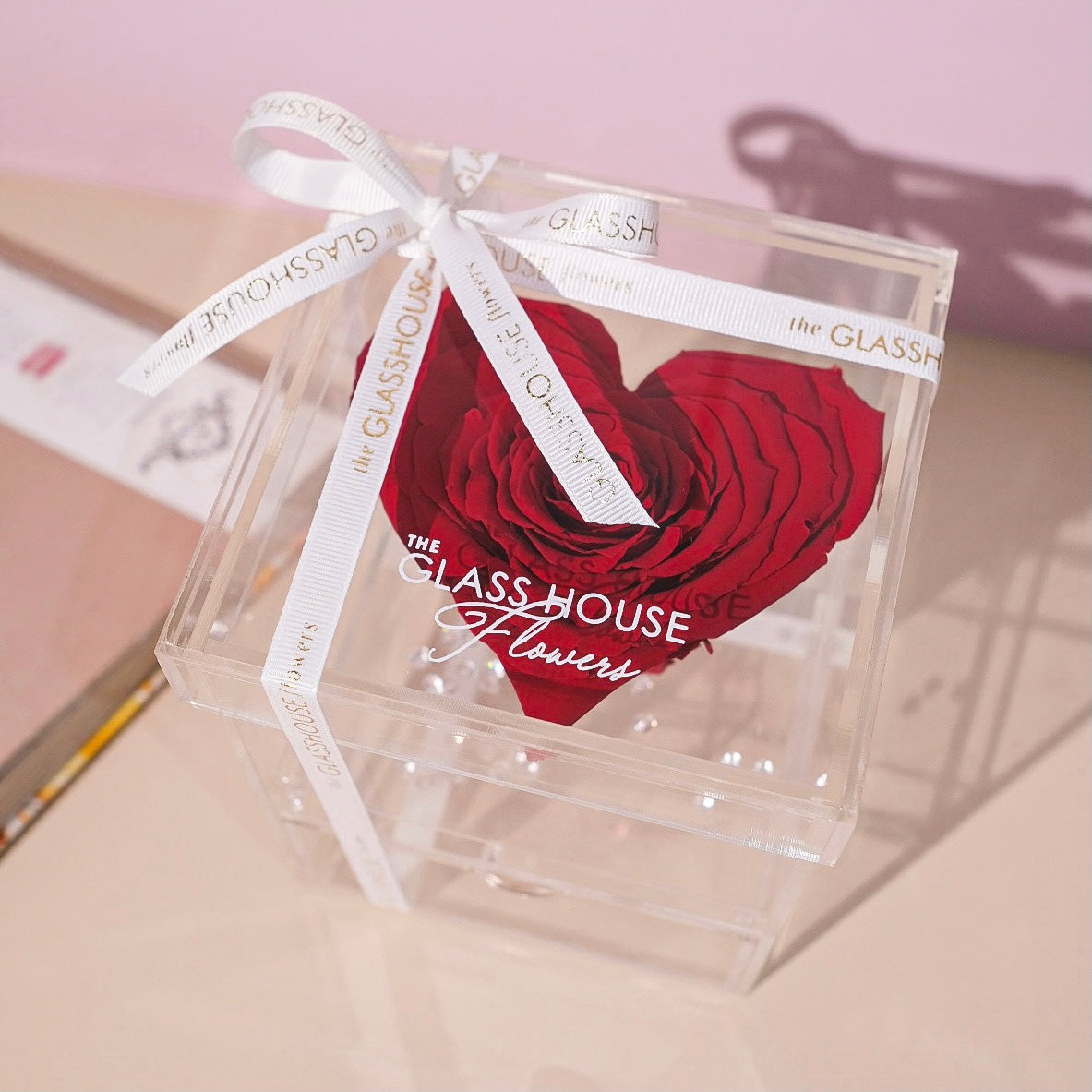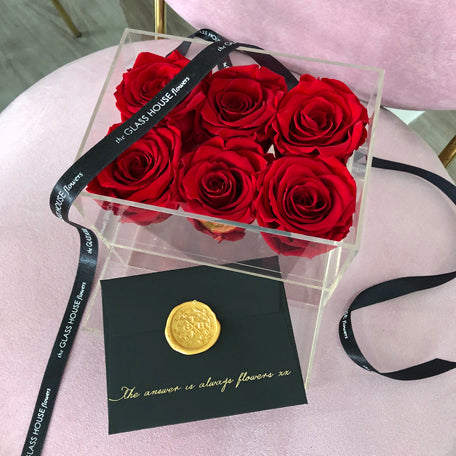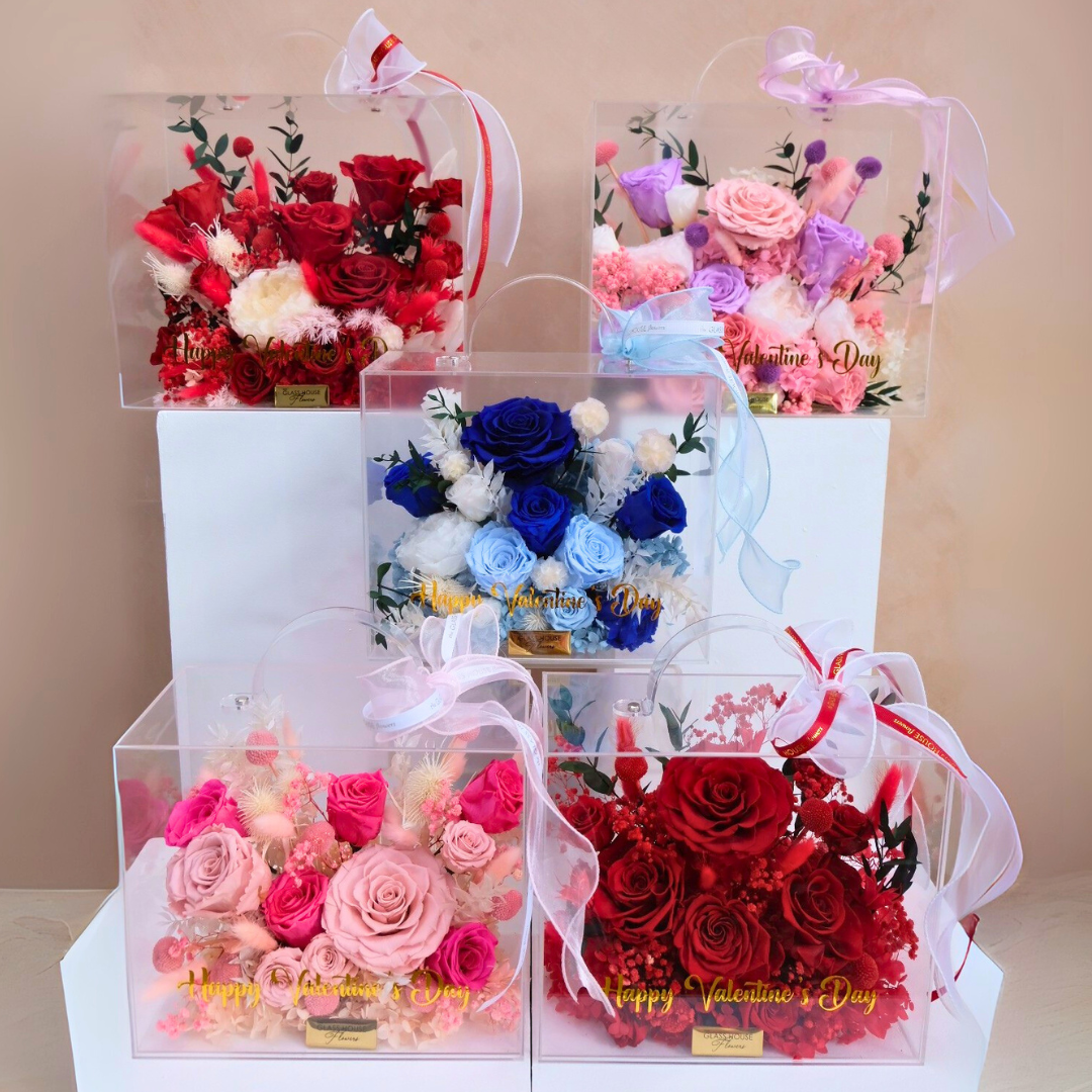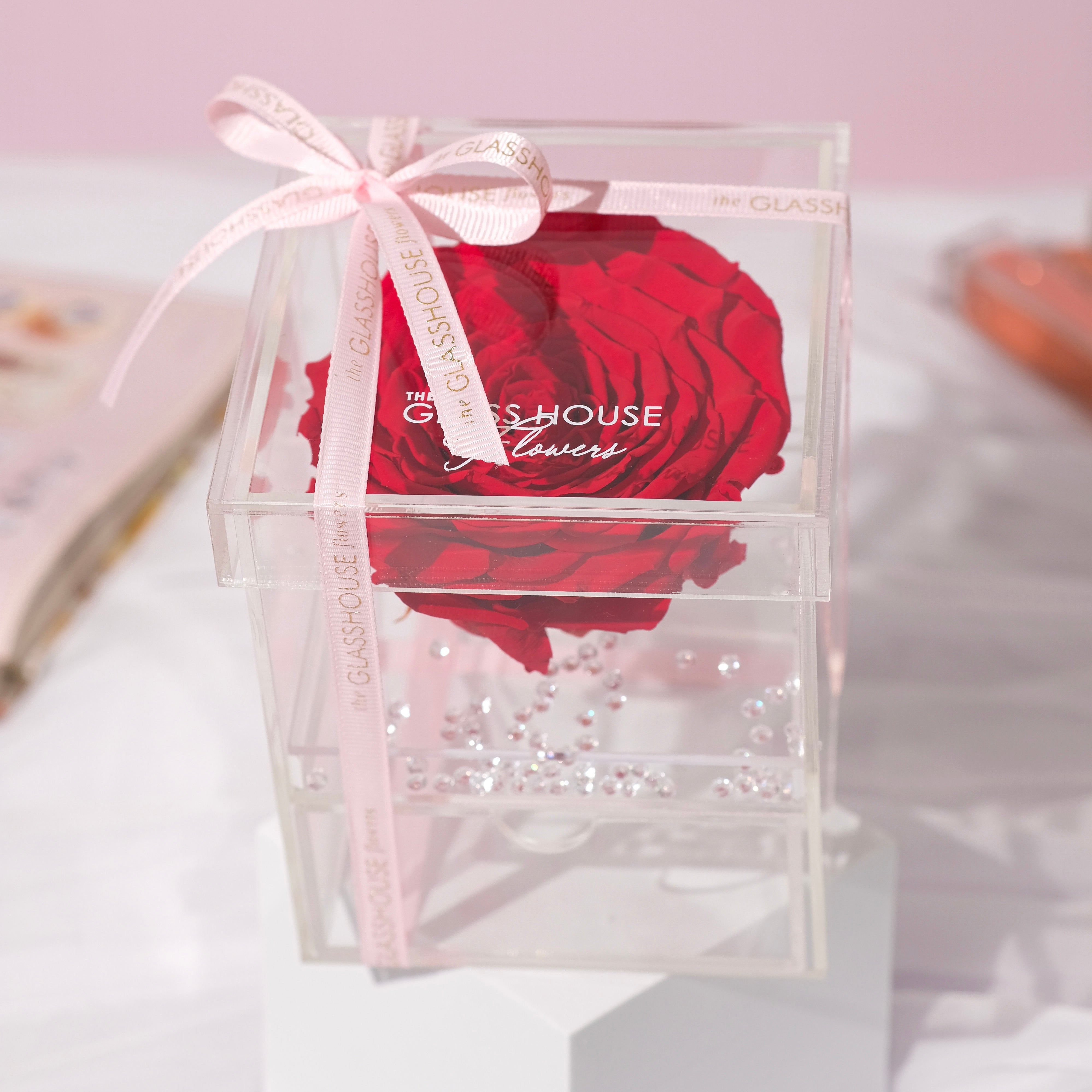 Forever flowers encased in premium acrylic boxes and photo frames. Timeless, modern keepsakes with preserved roses.