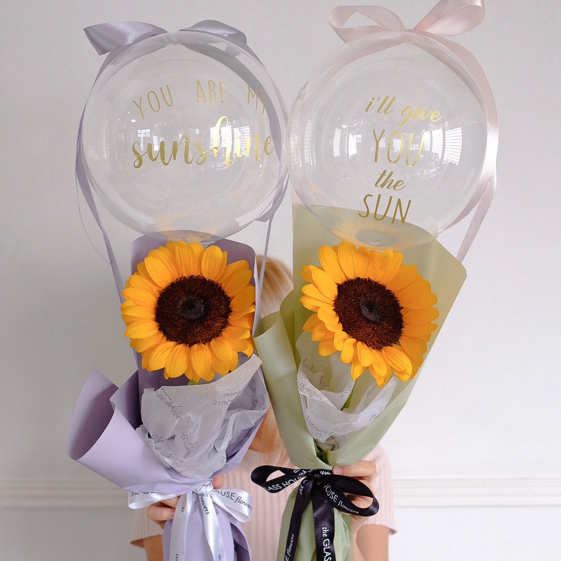 Fresh single sunflower bouquet with a personalized bubble balloon.