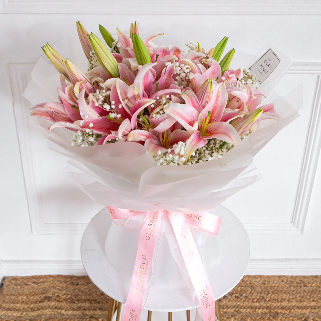 This bouquet features Stargazer lilies and gypsophila, also known as "Baby's Breath".