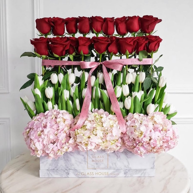 An exquisite arrangement of 16-18 Ecuadorian Roses, 40 Tulips and 3 Hydrangeas in our Marble Rectangulaire Box.