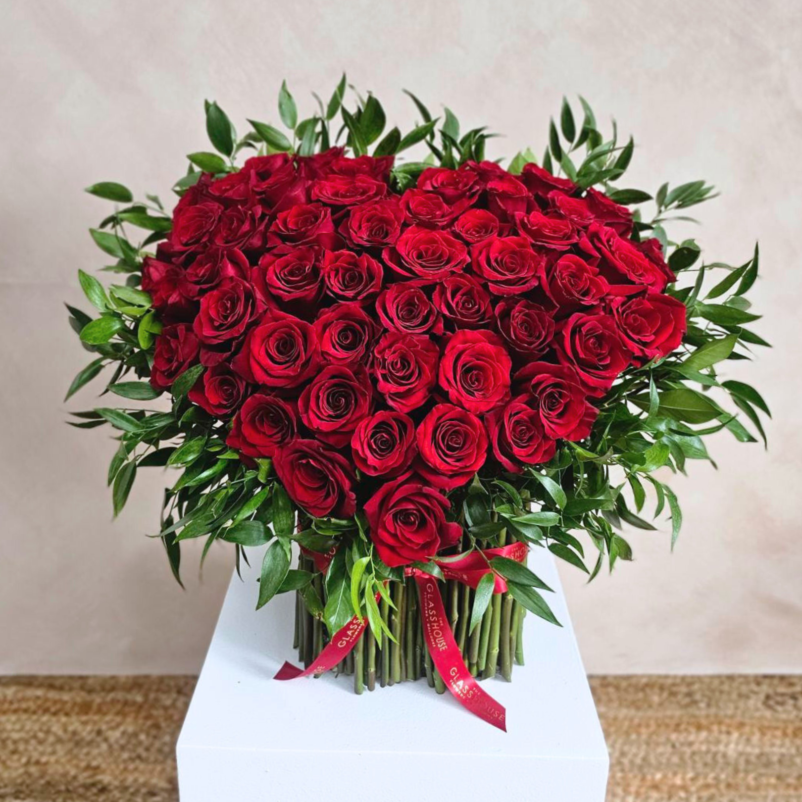 A luxurious standing bouquet of 50 fresh Ecuadorian roses adorned with Italian ruscus leaves, and showcasing its stems in all its glory, arranged to create an unforgettable impression.